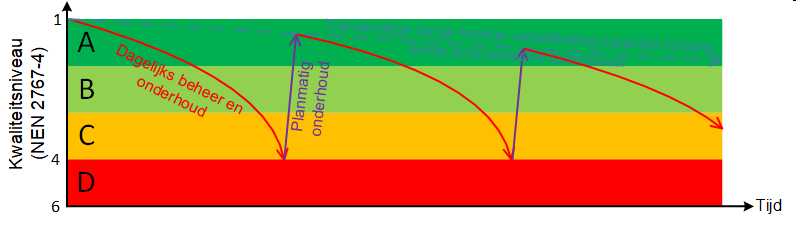 Om de infrastructuur beschikbaar te houden, kijken we regelmatig naar de staat ervan en bepalen we het beste onderhoud. Dit doen we met een gestandaardiseerde methode. In afbeelding B hebben we dit zichtbaar gemaakt. Hoe langer een weg of oever ergens ligt, hoe meer gebreken er kunnen ontstaan. Voordat de staat ‘onacceptabel’ is, gaan we met de weg of oever aan de slag (paarse lijn). Als we langer zouden wachten, kan een weg of oever onveilig worden. Als we niet lang genoeg wachten, maken we onnodige kosten. Tussendoor zorgen we met dagelijks beheer en onderhoud ervoor dat de weg of oever zo lang mogelijk in goede staat blijft (rode lijn). Na een aantal herhalingen is het slimmer om te vernieuwen in plaats van nog een onderhoudsronde (zie ontwikkeling blauwe stippellijn).