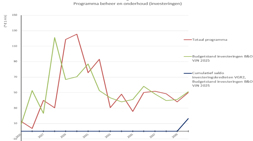 In onderstaande grafiek zie je de ontwikkeling van geld dat we investeren in beheer en onderhoud. We verwachten dat de middelen die we nu beschikbaar hebben genoeg zijn voor de looptijd van het MJOP. Dat betekent dat we genoeg geld hebben om oevers en funderingen te vervangen. Zoals we in de NOK beschrijven hebben we geen middelen gereserveerd voor de vervanging van beweegbare kunstwerken, omdat dit de komende vijftien jaar nog niet aan de orde is.