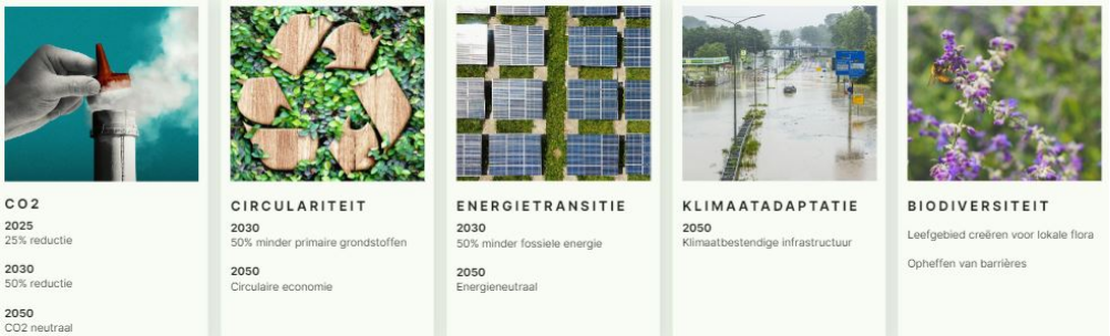 - Circulair werken. We verminderen afvalstromen en beperken het gebruik van nieuwe grondstoffen. Dit doen we onder andere door gebruikt asfalt te verwerken in nieuw asfalt. We gebruiken circulaire marktplaatsen om ‘tweedehands’ materialen te zoeken en aan te bieden. De focus ligt op vijf materialen met de grootste impact binnen de provincie: asfalt, staal, beton, bagger en bermmaaisel.